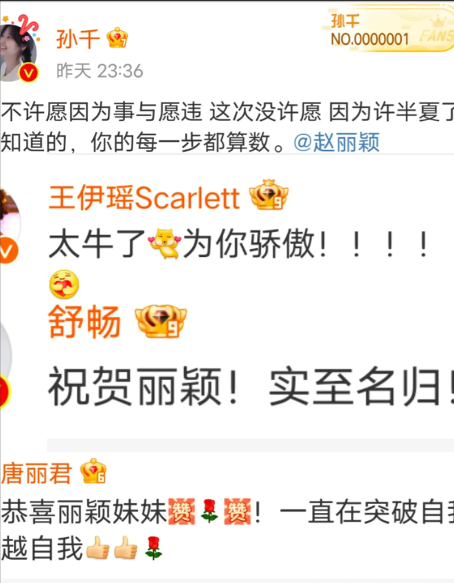 赵丽颖的好闺蜜们当然也没闲着,孙千、谢娜、王伊瑶这些东说念主纷繁在驳倒区给她送祈福,满满的真情实感,字里行间都是为她欢笑。