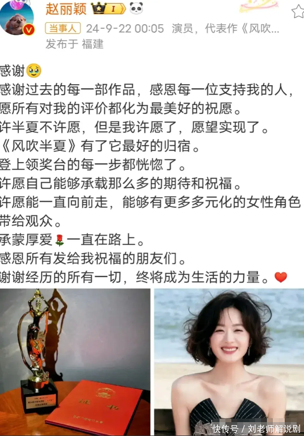 受奖仪式截止后,赵丽颖晚上还发了条感言,感谢一皆以来的每一个作品和相沿她的粉丝一又友。她说我方在领奖台上感到迷概括糊,像是在作念梦似的。