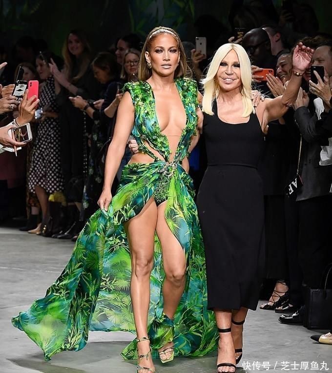 2019 年 9 月 20 日,詹妮弗·洛佩兹 (Jennifer Lopez) 和多纳泰拉·范念念哲 (Donatella Versace) 在米兰时装周时辰的范念念哲 (Versace) 秀场上走秀。她所穿的裙子灵感源自 2000 年代初期格莱好意思奖战胜!